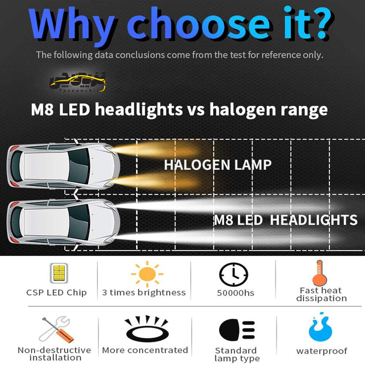 چراغهای الایدی Conpex M8 جدید ارتقا یافته از تراشههای LED درجه یک خودرویی، 100 وات، 15000 LM در هر جفت، 6500K سفید سرد استفاده میکنند. خروجی نور فوق العاده متمرکز و پایدار. دید گسترده تر و دورتر را فراهم کنید. این لامپ 6 برابر روشن تر از لامپ هالوژن اصلی است. لامپ های LED بسیار سازگار برای انتخاب شما عالی هستند.
